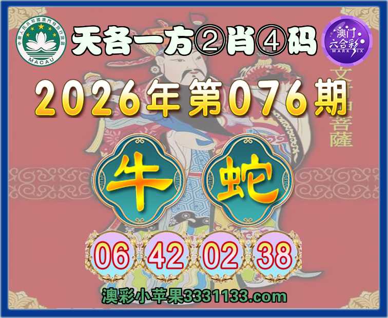 076期:『天各一方』 ②肖④码【牛】【06.42.02.38】开:蛇02
