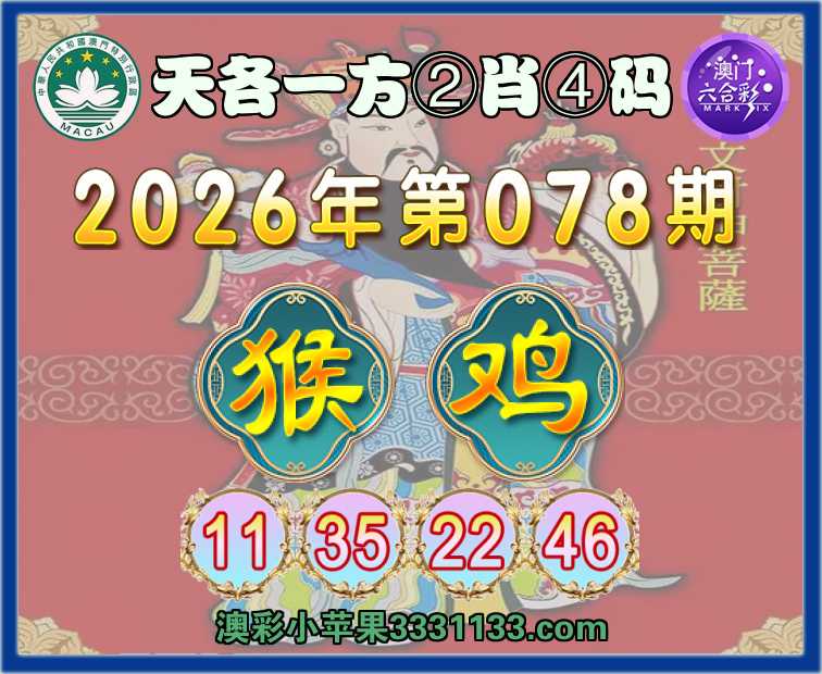 078期:『天各一方』 ②肖④码【猴】【11.35.22.46】开:鸡46准上榜高手